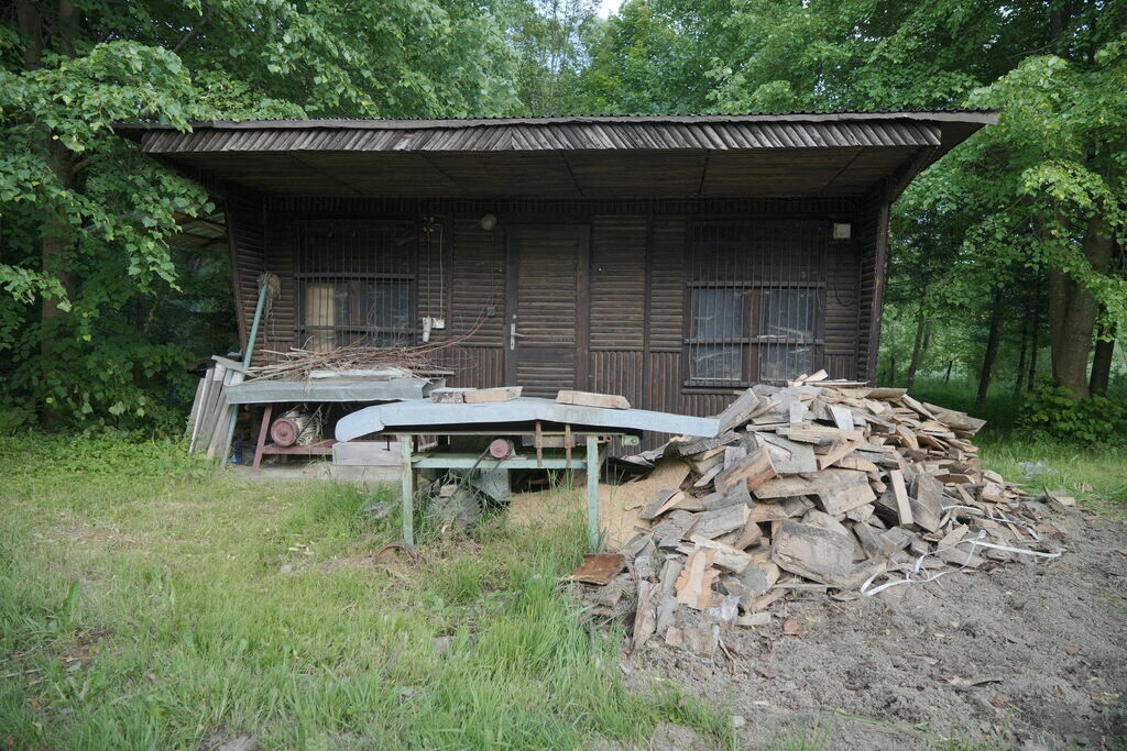osypnik), maszyny stolarskie, narzędzia warsztatowe, sezonowane deski