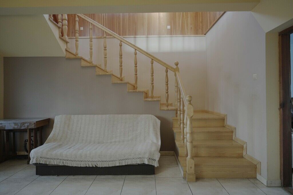 salon/ hol z drewnianymi schodami na wylewce betonowej. Oprócz tego